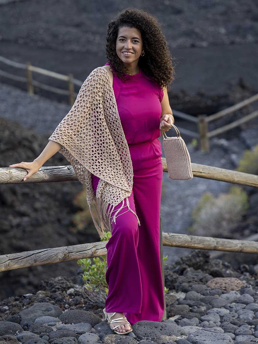 Su tono neutro y natural lo convierte en un complemento muy versátil, fácil de combinar tanto con looks informales como con estilismos más especiales. El calado del tejido aporta movimiento y una caída suave que se adapta al cuerpo con naturalidad.